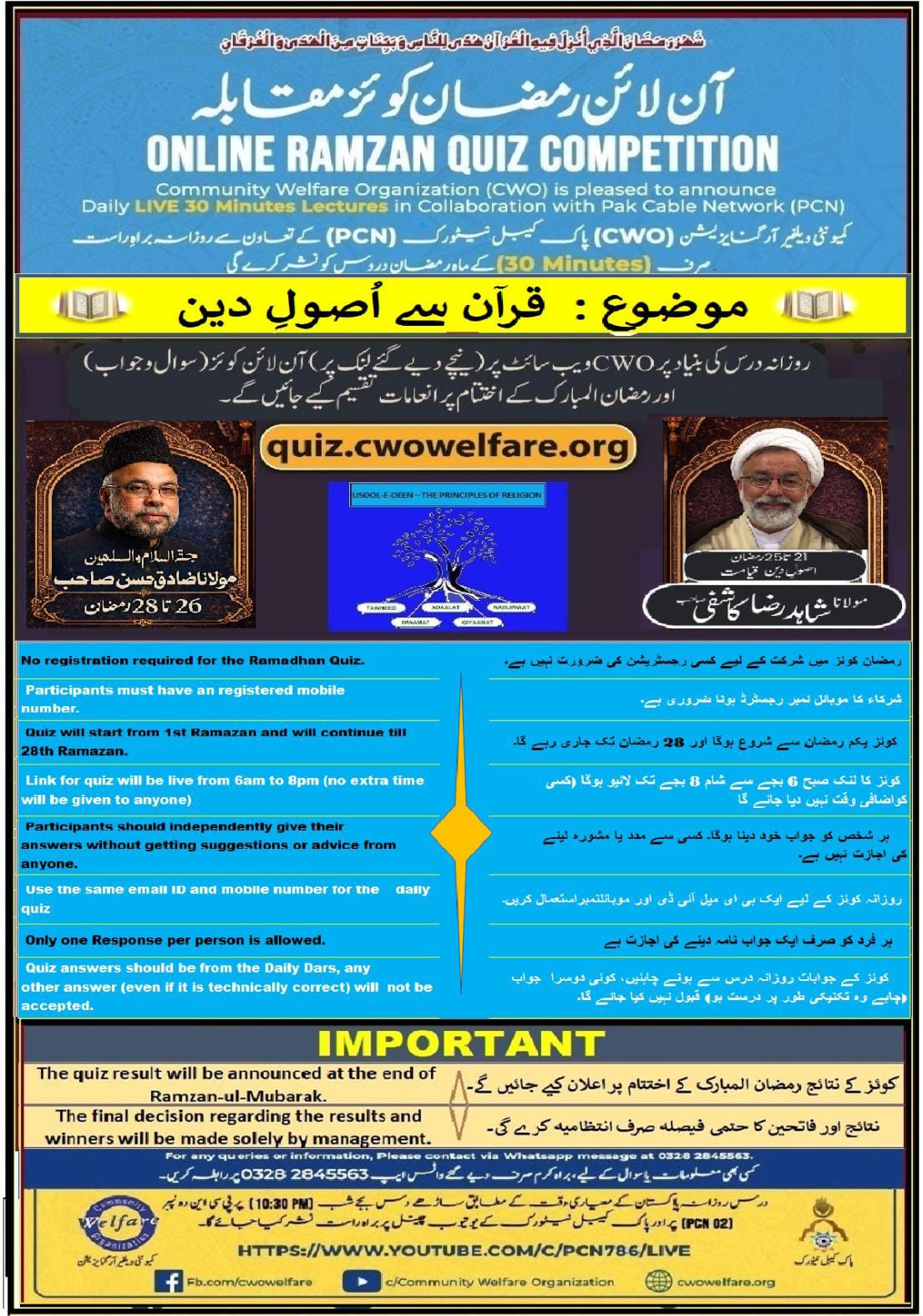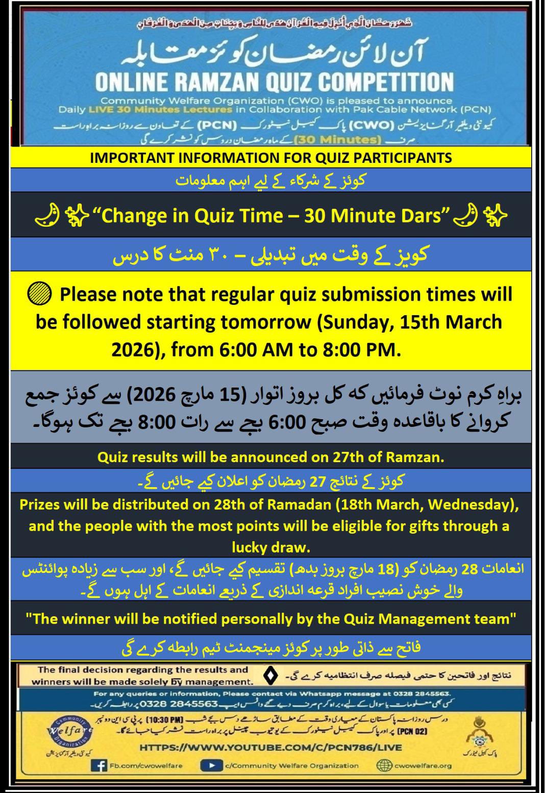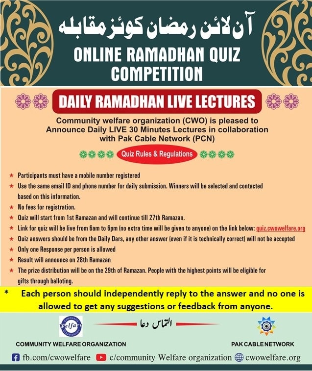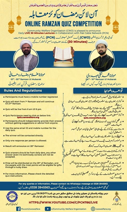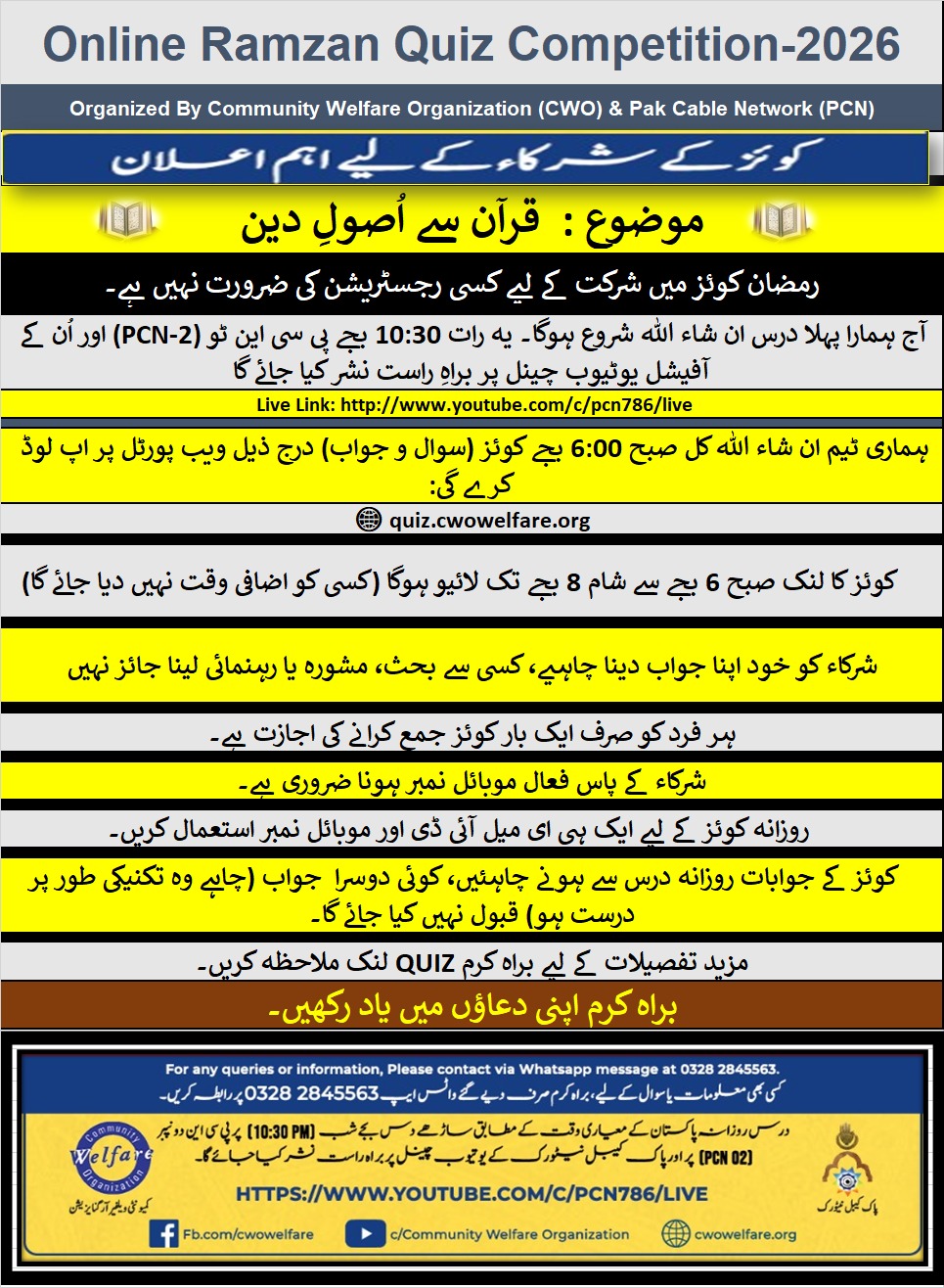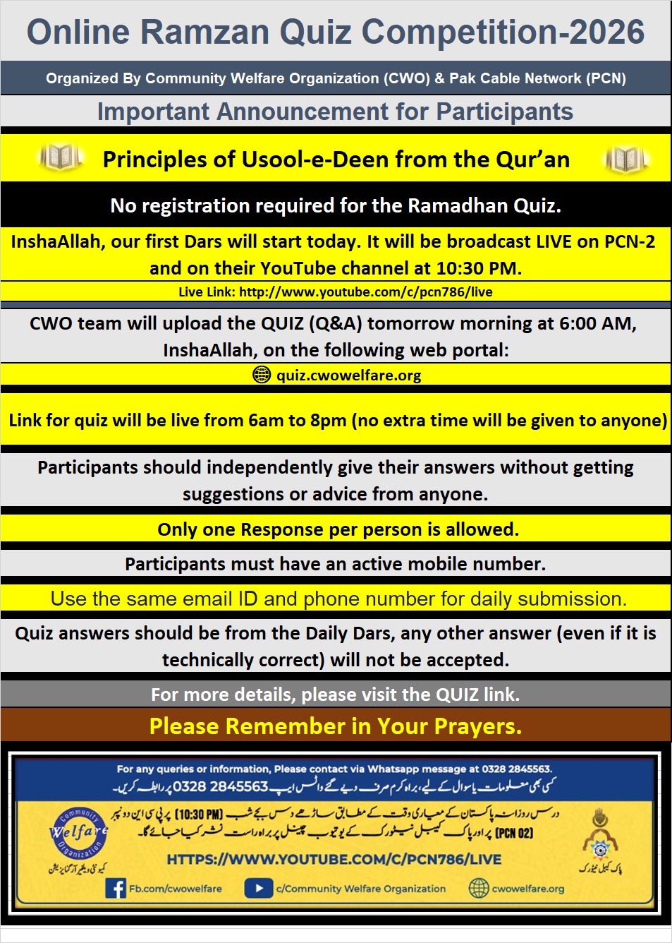 We extend our heartfelt gratitude to all of you for your enthusiastic participation in the quiz event held during Mah-e-Ramzan-ul-Mubarak-1447H/2026, organized by CWO and PCN. Your active involvement and commitment to learning have truly made the event a success. We are thrilled by the level of engagement and interest shown by each participant.