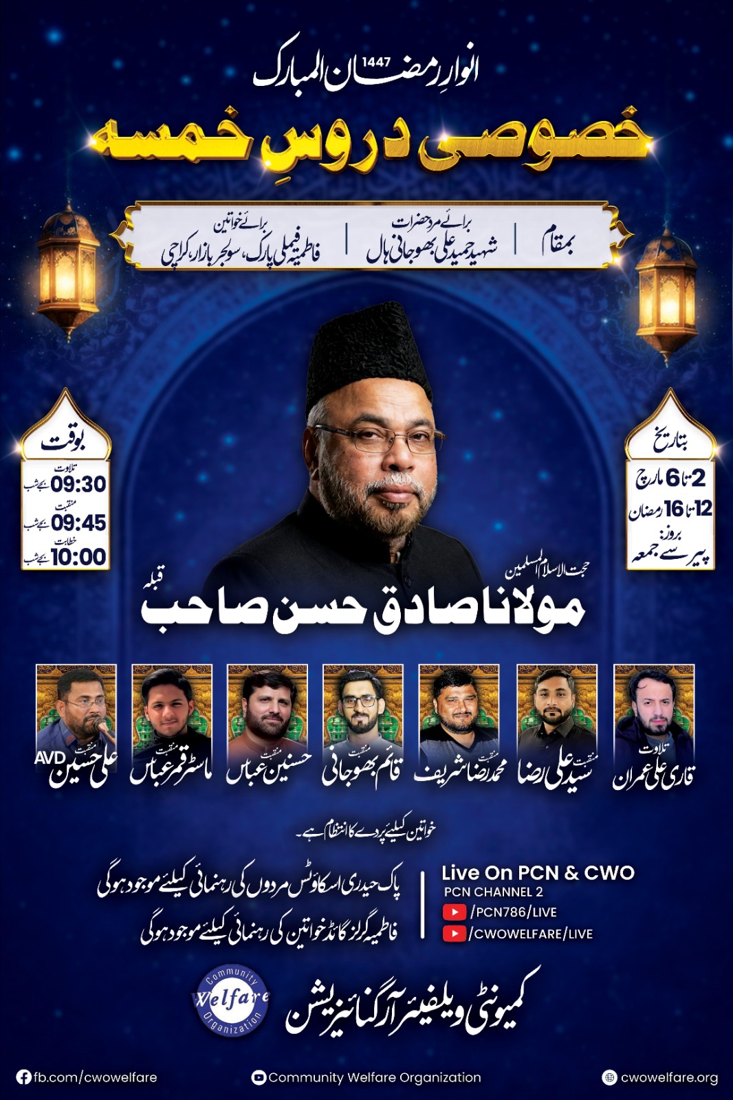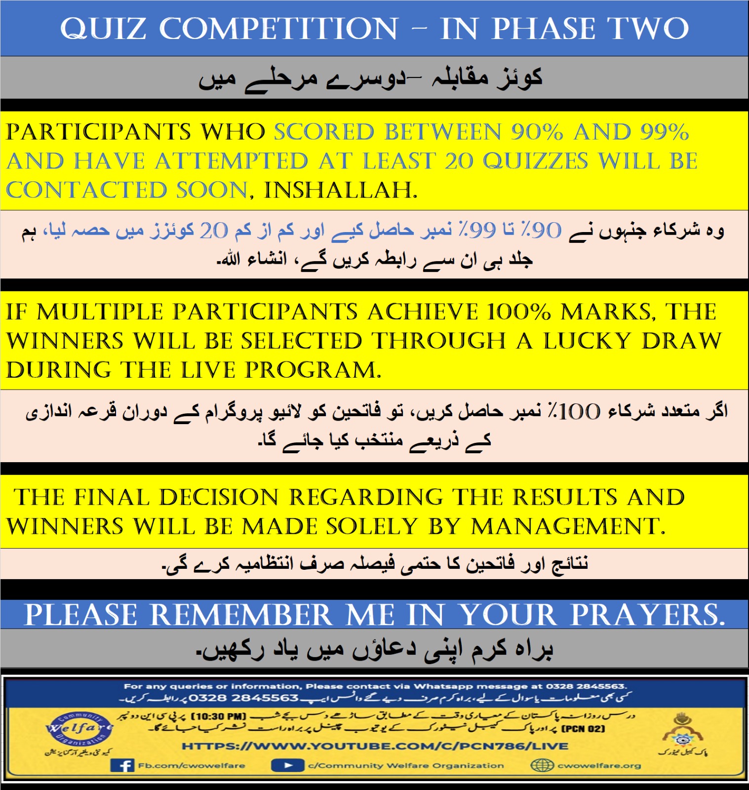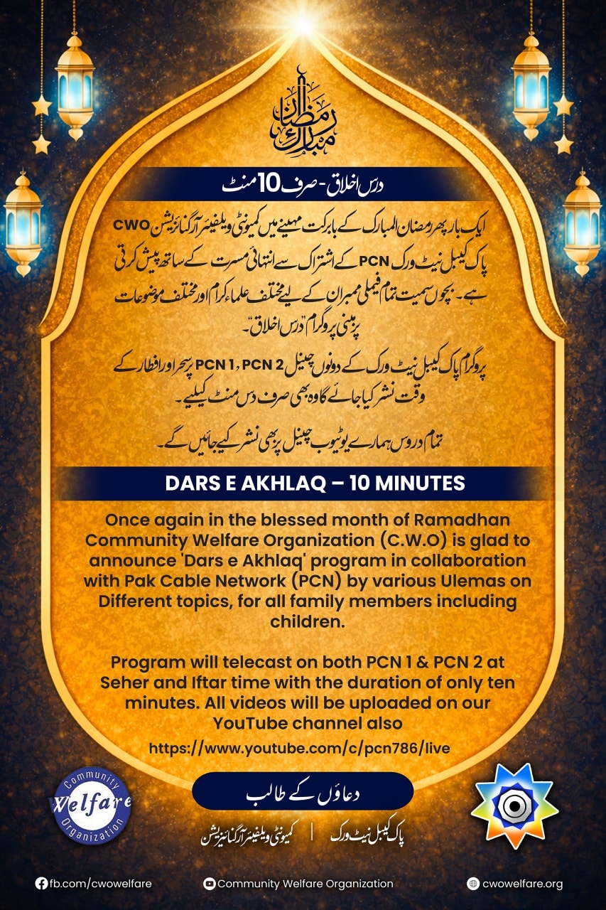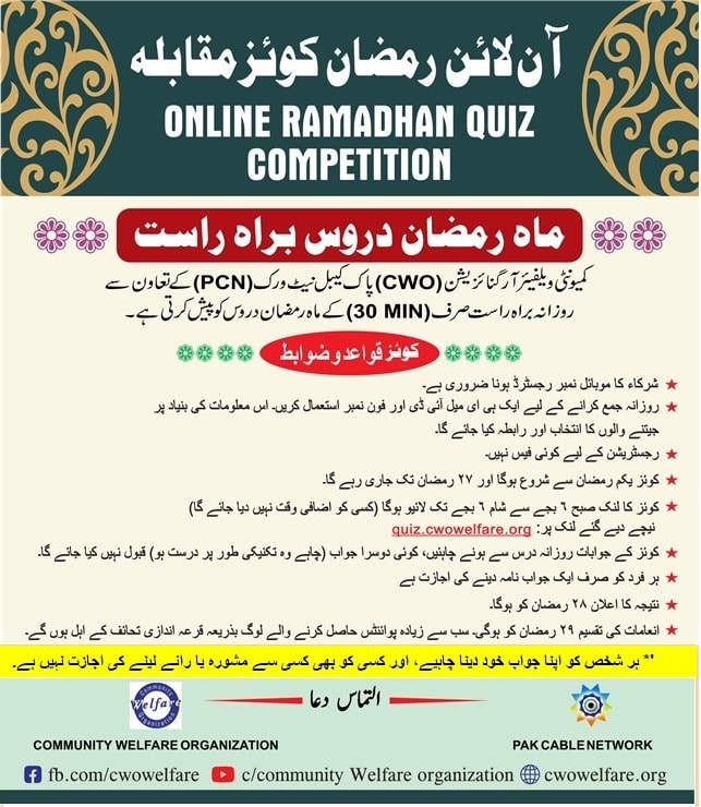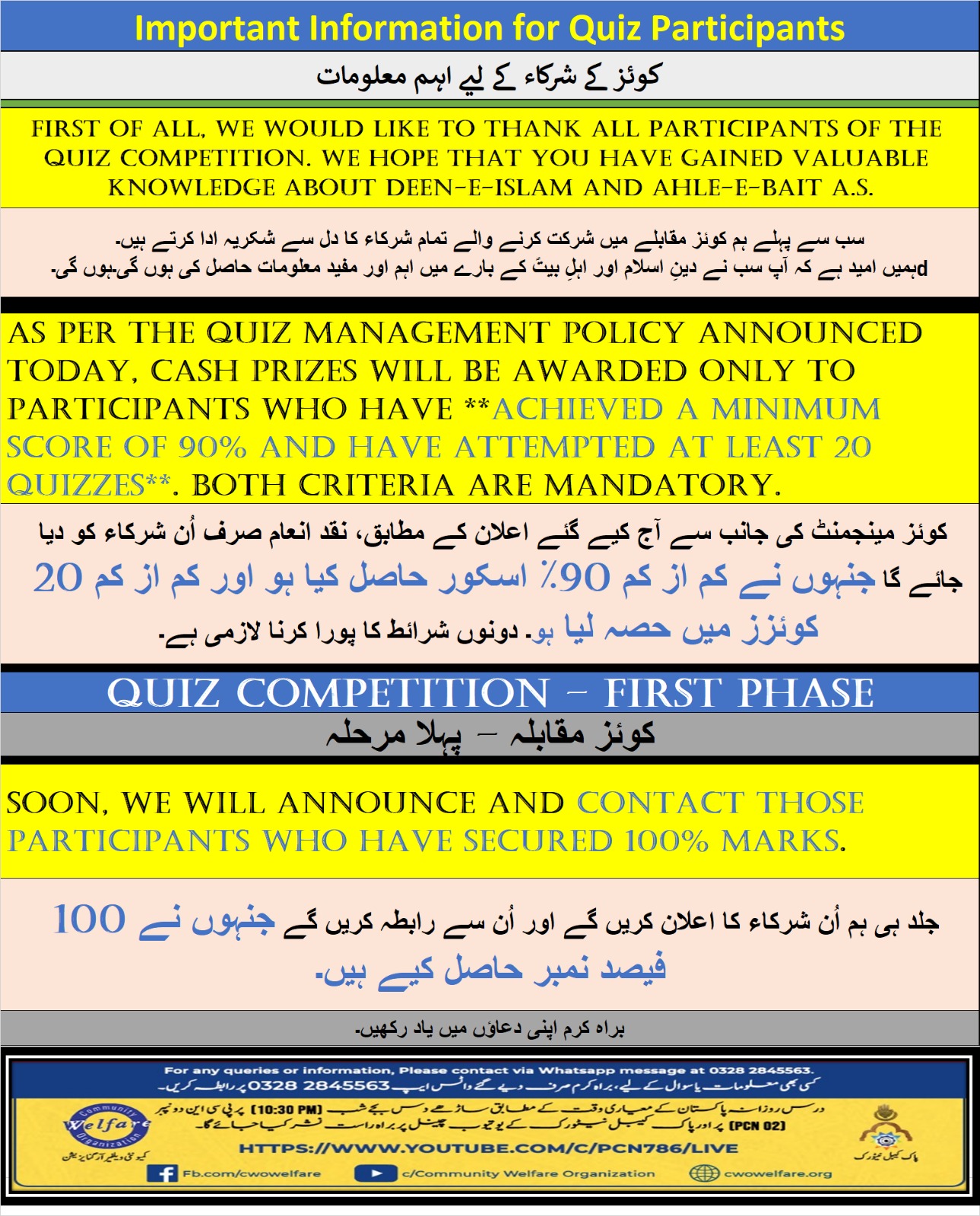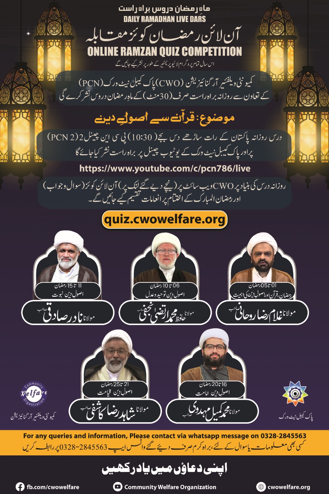 We extend our heartfelt gratitude to all of you for your enthusiastic participation in the quiz event held during Mah-e-Ramzan-ul-Mubarak-1447H/2026, organized by CWO and PCN. Your active involvement and commitment to learning have truly made the event a success. We are thrilled by the level of engagement and interest shown by each participant.