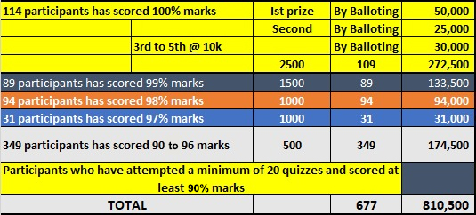 Only those participants who have attempted a minimum of 20 quizzes and obtained scores between 90% and 100% are eligible for prize. Both conditions are mandatory.